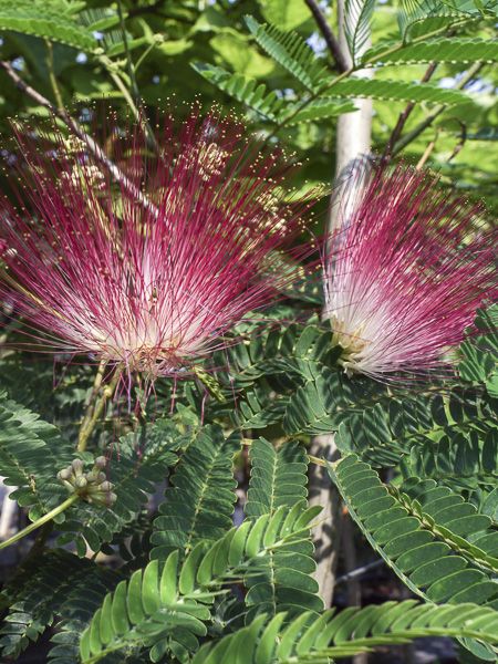 Sélection d'arbre de soietrès rustique, jusqu'à -15°C, à l'abondante floraison plumeuse, rose intense. Grandes feuilles vert clair divisées en nombreuses folioles.
