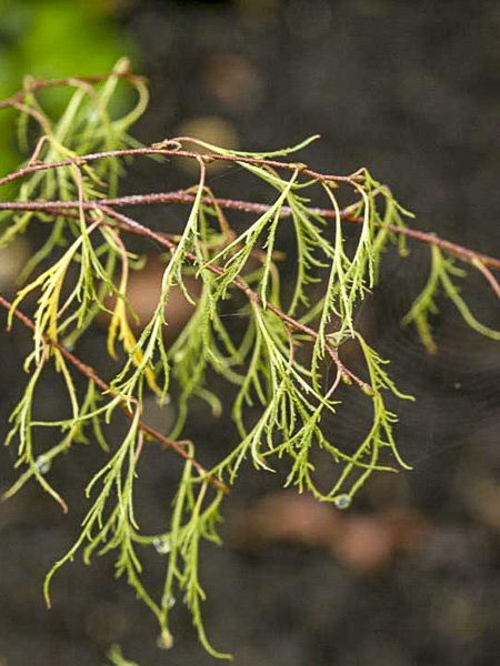 Arbre à rameaux retombants. Feuilles vert vif, peu lobées, profondément découpées.