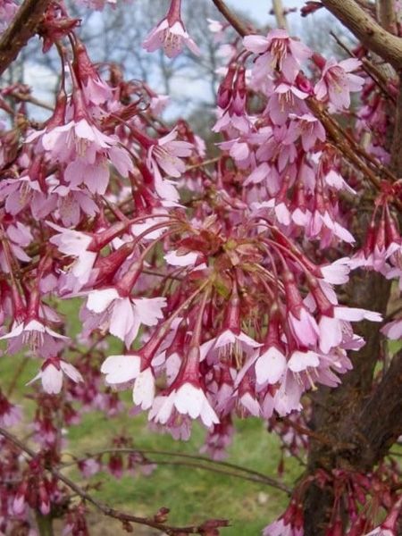 Hybride Prunus campanulata x P. incisa. Fleurs rose vif à base carminée. Très florifère, longue période de floraison. Feuillage flamboyant en automne.