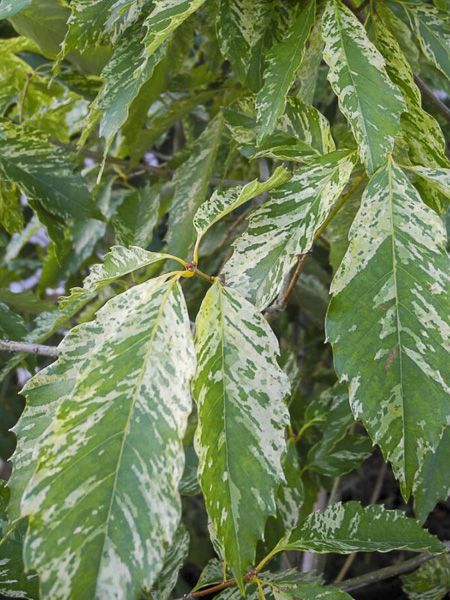 Feuilles proches de celles du châtaigner, vert moyen fortement panaché de blanc. Petit développement, croissance lente.