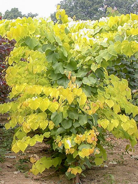 Une sélection de gainier du Canada au port étalé. Jeunes feuilles bronze, puis dorées, vert pâle en été, jaune en automne. Fleurs rose-violacé en bouton, puis rose pâle, avant les feuilles.