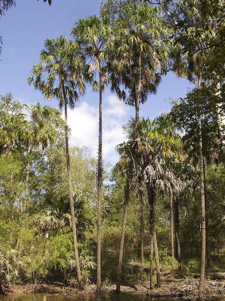 Palmier rare en culture, de croissance rapide, au stipe élancé et crevassé. Au sommet, bouquet de grandes feuilles presque circulaires en éventail, découpées en segments retombants. À cultiver en extérieur, hors gel ou en véranda.