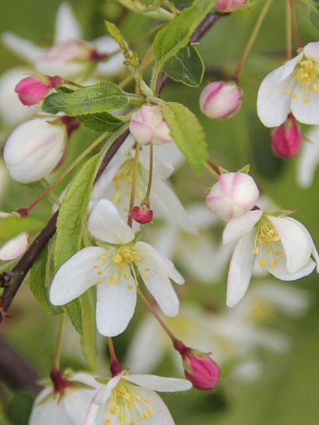 Arbre élancé à branche charpentière jusqu'à la cime, s'étalant avec l'âge. Feuilles ovales, dentées. Abondante floraison de fleurs simples rose très pâle, à partir de boutons rose violacé, suivies de fruits jaune orangé, de 1 cm de diamètre, à la fin de l