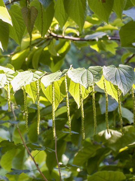 Arbre rare en culture, au port arrondi. Feuilles cordiformes, vert moyen, jaune à rouge en automne. Floraison en longs chatons pendants jaunâtre, suivie de fruits décoratifs, disposés en guirlande. Rustique jusqu'à -15°C.