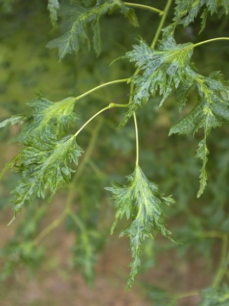Taille moyenne, à large couronne pyramidale. Jeune rameaux pubescents. Feuilles profondément et irrégulièrement découpées, frisées, parfois torsadées, vert foncé. Floraison abondante, blanche.