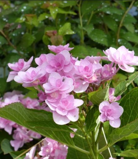 Inflorescences rondes, aux fleurs doubles bleu pâle en sol acide, sinon rose pâle.