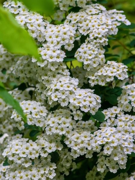 Arbuste compact à minces pousses arquées. Feuilles caduques vert sombre, en forme de losange. Abondantes ombelles, denses et petites, de fleurs blanches, tout le long des rameaux. Une des espèces les plus jolies.