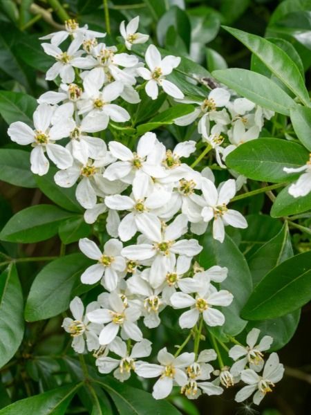 L'oranger du Mexique est un habitué des jardins. Très rustique, on reconnait immédiatement son port arrondi, son feuillage persistant et décoratif et sa floraison blanche et parfumée au printemps. Si certaines variétés présentent des feuilles plus ou moins fines et dorées, toutes ont une floraison blanche excepté 'Apple Blossom' aux fleurs légèrement rosées.