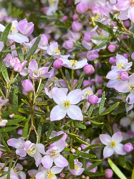 Petit arbuste originaire d'Australie, densément ramifié, au feuillage persistant, vert clair, finement découpé, aromatique. Abondante floraison du début du printemps au début de l'été en petites fleurs à 4 pétales rose magenta pâle, légèrement parfumé, du début du printemps jusqu'à l'été. Rusticité -5°C.