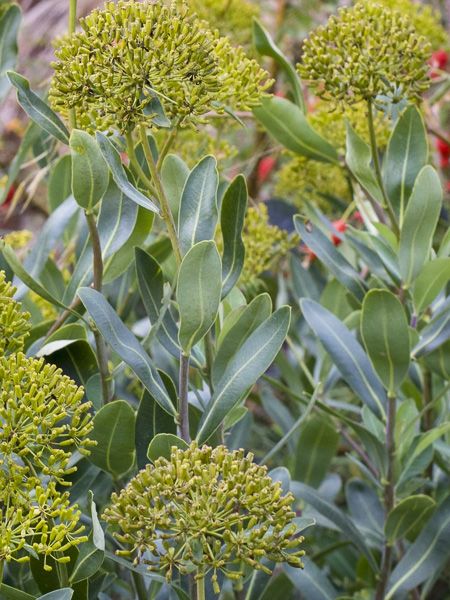Petit arbuste aux feuilles persistantes, épaisses et coriaces, vert bleuté et fleurs jaunes en ombelles, suivies de petits fruits étoilés. Croissance assez rapide, il supporte bien la taille. Idéal en bord de mer.