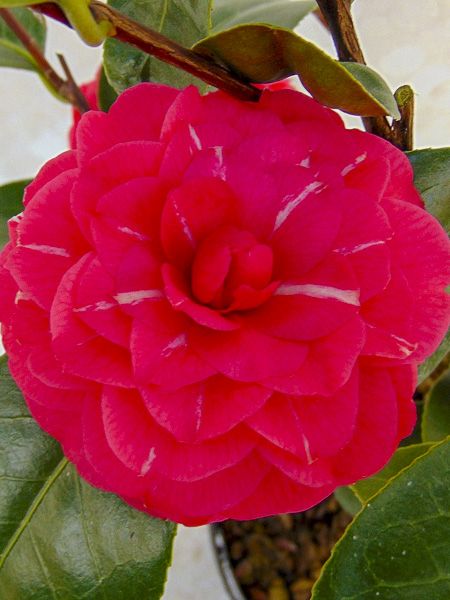 Ancienne variété de camélia aux fleurs aux pétales imbriqués, rouge cerise strié de blanc.