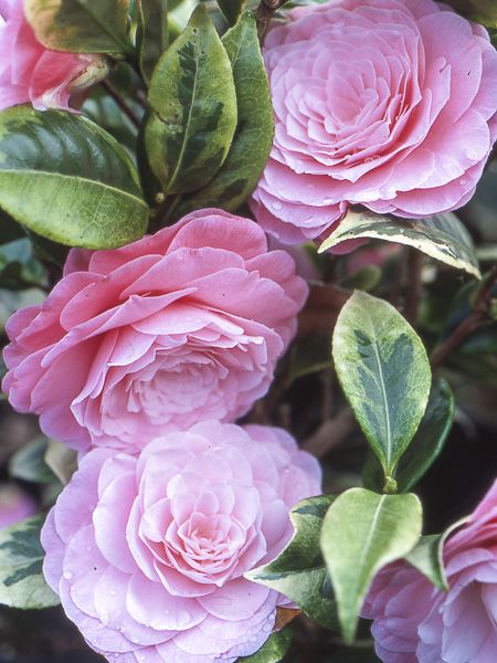 Variété de camélia aux feuilles panachées vert sombre, vert tendre et crème. Il produit des fleurs doubles aux pétales imbriquées rose tendre.