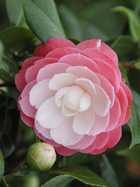 Camélia buissonnant aux fleurs doubles, aux pétales superbement arrangées, rose soutenu à l'extérieur jusqu'au blanc au cœur.