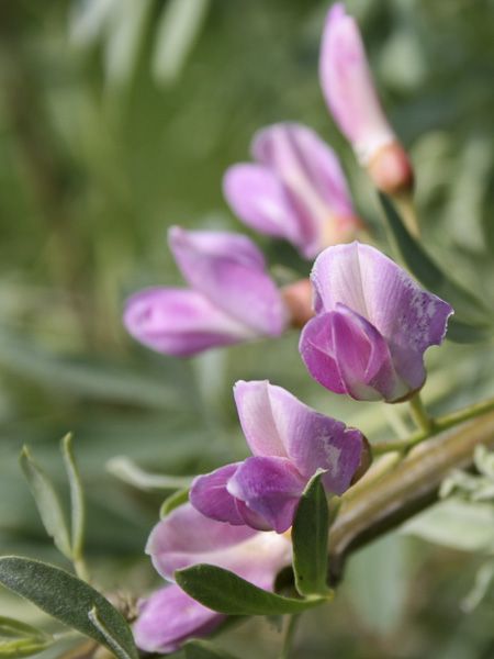Arbuste à feuilles caduques gris argenté. Il produit des grappes de fleurs papilionacées rose pourpré, suivies de fruits. Il supporte les sols salés, mais pas l'humidité hivernale.