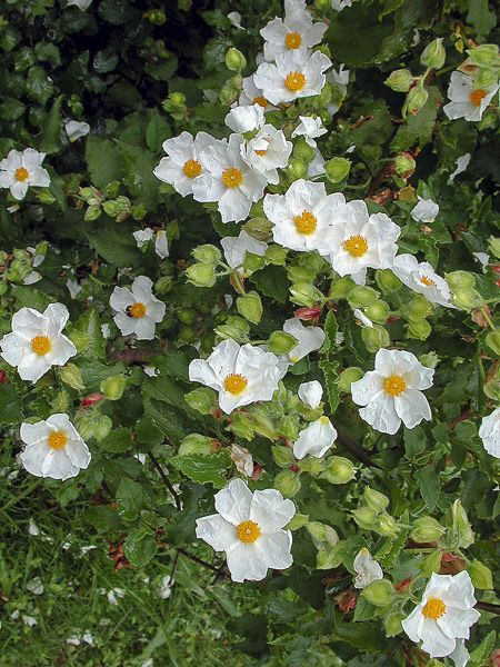 Ciste bien ramifié. Grandes feuilles persistantes, aromatiques, vert foncé, rouge violacé en hiver. Fleurs blanches à cœur d'étamines jaunes. Rustique jusqu'à -10°C.