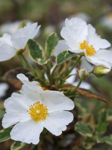 Arbuste compact, buissonnant aux feuilles vertes marginées de crème. Les boutons roses donnent des fleurs blanches, groupées par deux ou trois en cymes terminales, avec le centre et les étamines jaunes. Le plus rustique des cistus.