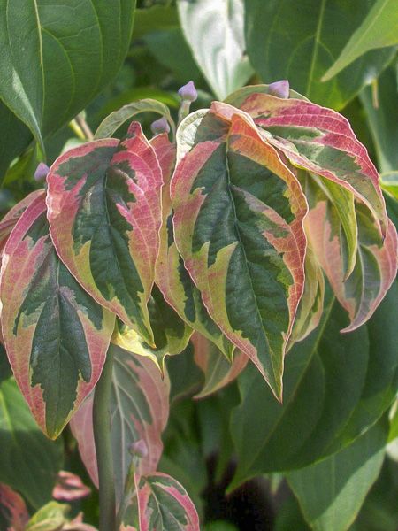 Une belle nouveauté de cornouiller à grandes fleurs pour son feuillage panaché, évoluant au fil des saisons. Les jeunes feuilles panachées de vert, rose et blanc, vert et blanc en été, vert, rose, pourpre et jaune en automne. Fleurs rose rubis en même temps que les premières feuilles.
