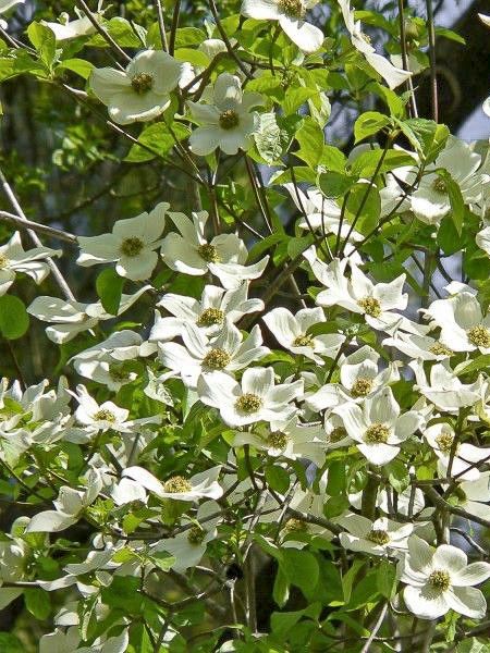 On l'appelle "dogwood" aux États-Unis. Sa floraison est spectaculaire en mai. En fait, ce ne sont pas des fleurs mais des bractées. La coloration de ses feuilles en automne est aussi un atout.