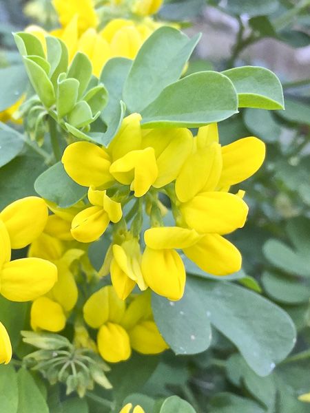 Arbuste compact, à feuilles composées de folioles, vert bleuté, portant des bouquets de fleurs de pois jaune citron, au printemps, se renouvelant en fin d'été. Pour climat sec et chaud, en sol pauvre et bien drainé. Rustique jusqu'à -12°C.