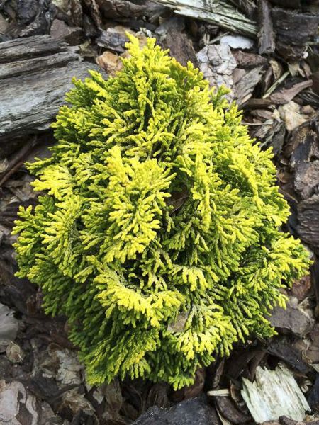 Nain, très compact, un peu tortueux. Jeunes feuilles dorées, les plus anciennes vertes. D’abord globuleux, puis conique.