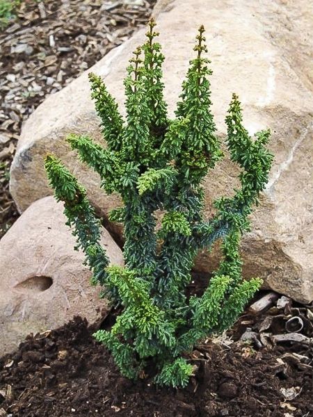 Nain, dressé. Végétation anarchique. Feuillage vert sombre, plus ou moins grisâtre ou bleuté selon l'exposition. Croissance très lente.