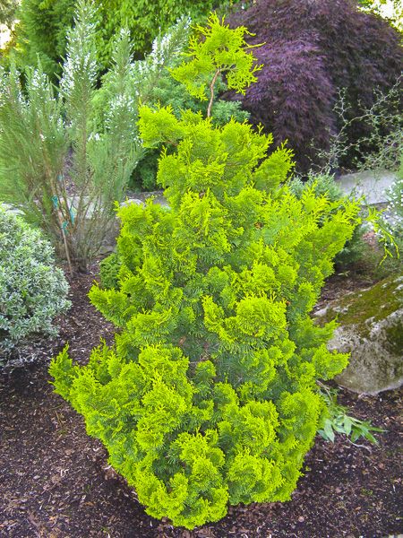 Nain, conique à globuleux. Feuillage dense, plumeux, jaune-vert lumineux.