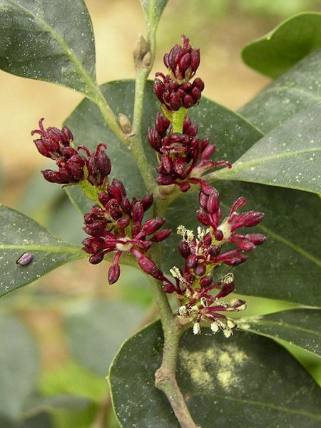 Arbre ou arbuste étalé. Feuilles de 3-7 cm de long, étroites, obovales à oblongues, coriaces, brillantes, vert foncé. Grappes dressées de fleurs apétales, de 3-5 cm de long, à étamines pourpres et calice rouge.
