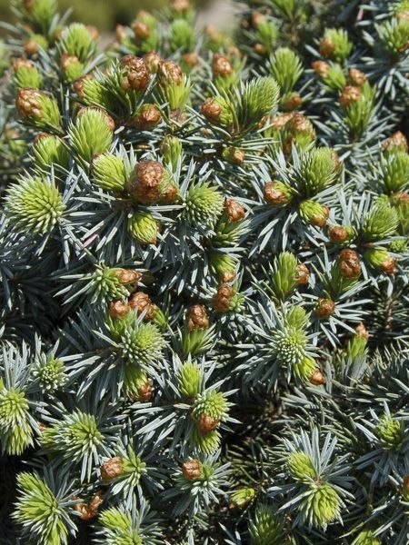 Nain, compact, en pain de sucre aplati. Nouvelles pousses vert tendre, virant au gris bleu. Croissance lente.