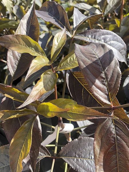 Feuilles d’abord bronze, puis pourpre-chocolat en été virant à l'orange à l'automne.