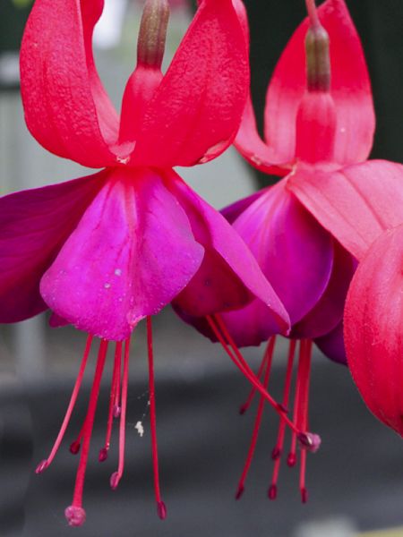 Fleurs simples. Corolle aux pétales rose fuchsia, calice et sépales rouges, étamines rouges. Solide et vivace. Rustique jusqu'à -10°C.
