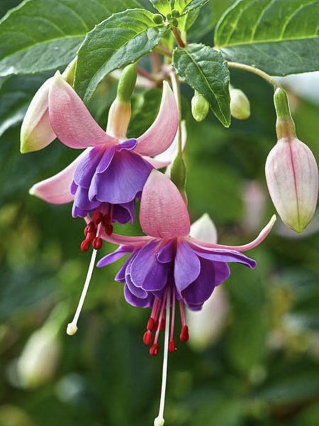Fuchsia au port retombant. Grosses fleurs à corolle double, violette et sépales rose pastel. Pour les potées fleuries ou les suspensions.