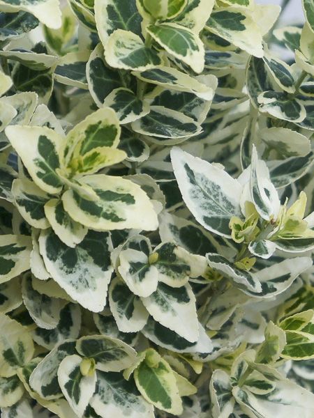 Feuilles vert foncé fortement et irrégulièrement marginé de blanc crème.