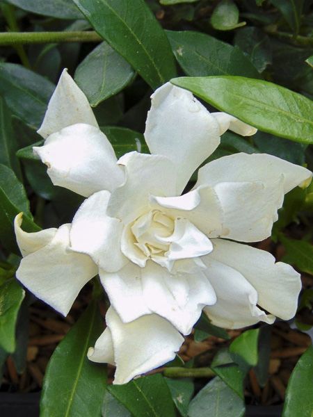 Variété de gardénia rustique jusqu'à -8°C, au port compact. Feuilles vert sombre lustré. Ses fleurs sont doubles, blanches, aux pétales ondulés, particulièrement parfumées. Pour climat océanique, doux et humide.
