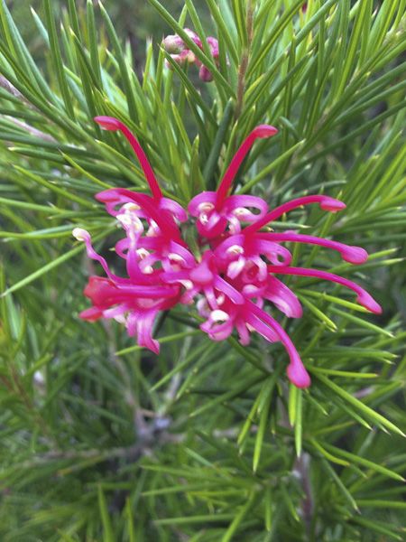 Hybride de G.juniperina x G. rosmarinifolia. Fleurs rose à rouge vif.