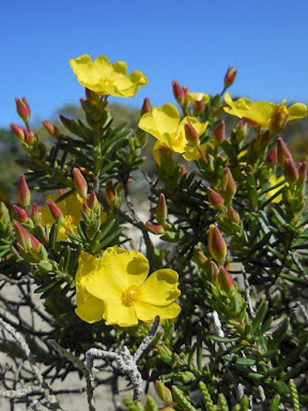 Proche des cistes, ce petit arbuste méditerranéen produit de nombreuses fleurs plates, jaune d'or, à partir de boutons rouges. Feuilles vert foncé, luisant.