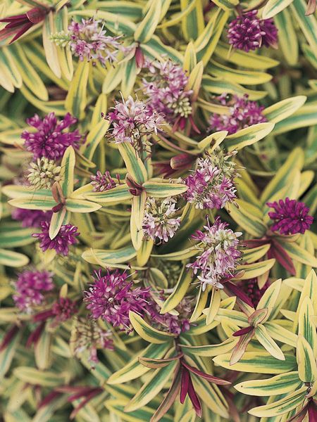 Coussin compact. Feuilles étroites, vert olive marginé de jaune crème. Jeunes pousses pourprées. Épis de fleurs rose pourpré.