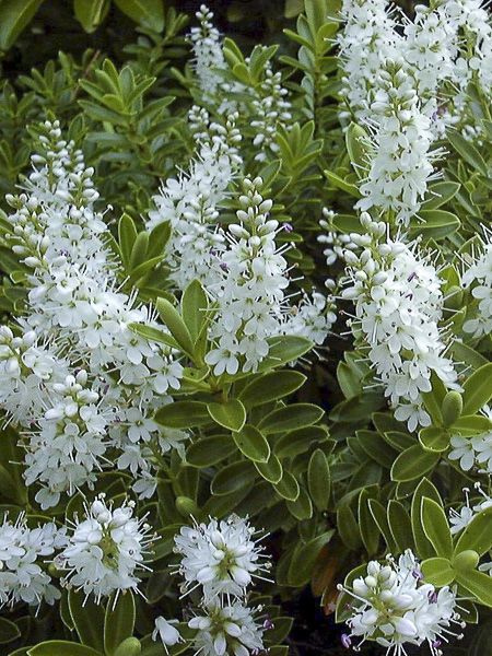 Véronique arbustive au port globuleux et compact. Feuillage serré, vert olive. Panicules de fleurs blanches.