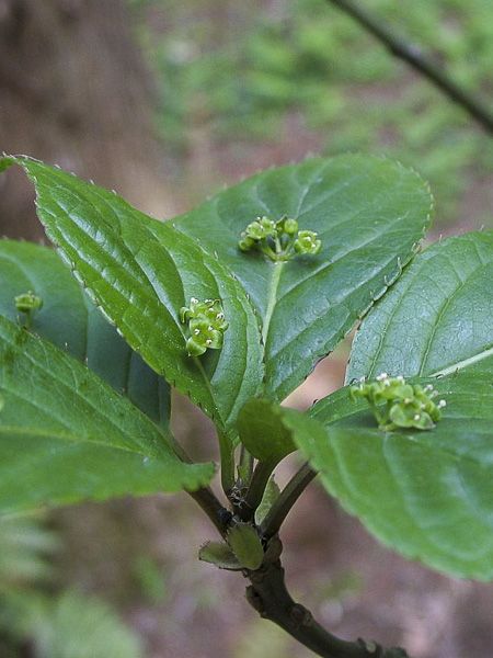Arbuste à feuilles alternes, arrondies, dentées, de 5-10 cm de long sur 3-5 cm de large. Fleurs dioïques, insérées au milieu du limbe de la feuille. Fleurs femelles peu nombreuses, non pédonculées, les mâles sont groupées en petites ombelles de plusieurs fleurs longuement pédonculées. Fruits en petites baies noires.
