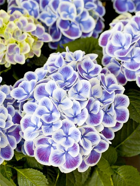 Parmi les l'Hydrangea macrophylla, on distingue deux types d'inflorescences : les têtes rondes (les plus connues) et les têtes plates. La gamme de couleur séchelonne du blanc le plus pur au bleu intense en passant par tous les tons du rose pâle au rouge foncé. La couleur de la fleur (excepté le blanc) peut varier suivant la nature du sol. Si il est acide (pH < 5,5) et qu'il contient du sulfate d'aluminium, les fleurs roses prendront une teinte bleue et les fleurs rouges deviendront violettes. L'Hydrangea macrophylla est un arbuste facile à vivre qu'on associera à d'autres hortensias ou à quelques plantes aimant les sols légèrement acides comme les fougères, les gaulthéries, les lamiers. Il est préférable de tailler ces hortensias après les dernières gelées. La taille provoque la naissance de nouvelles pousses et les boutons floraux naissent rapidement. Si une gelée tardive intervient, ces nouvelles pousses et les boutons risquent d'être endommagés. Il est préférable de supprimer les fleurs fanées après les dernières gelées afin de protéger la plante.