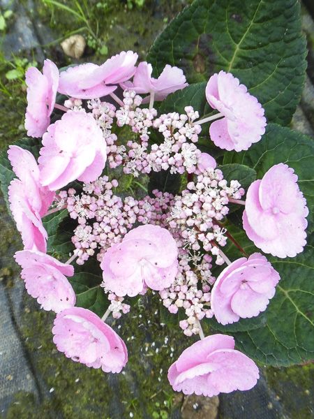 Inflorescences de type 'lacecap', de 12 cm de diamètre, rose tendre. Sépales des fleurs stériles dentelés.