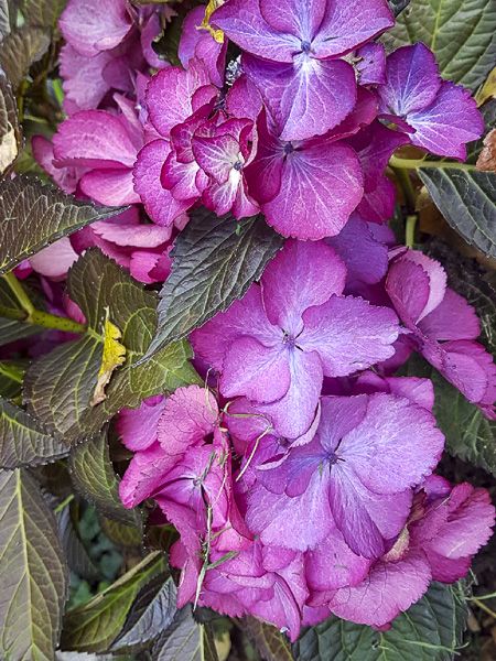 Résistant au soleil à pluie et au froid. Feuilles vert sombre à pourpre, fortement nervurées. Inflorescences de type lacecap aux fleurs rose violacé.