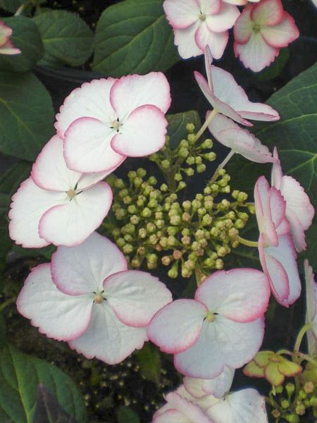 Inflorescences de type 'lacecap'. Fleurs stériles blanches bordé de rose. Feuillage vert pourpré.