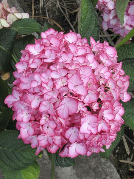 Parmi les l'Hydrangea macrophylla, on distingue deux types d'inflorescences : les têtes rondes (les plus connues) et les têtes plates. La gamme de couleur séchelonne du blanc le plus pur au bleu intense en passant par tous les tons du rose pâle au rouge foncé. La couleur de la fleur (excepté le blanc) peut varier suivant la nature du sol. Si il est acide (pH < 5,5) et qu'il contient du sulfate d'aluminium, les fleurs roses prendront une teinte bleue et les fleurs rouges deviendront violettes. L'Hydrangea macrophylla est un arbuste facile à vivre qu'on associera à d'autres hortensias ou à quelques plantes aimant les sols légèrement acides comme les fougères, les gaulthéries, les lamiers. Il est préférable de tailler ces hortensias après les dernières gelées. La taille provoque la naissance de nouvelles pousses et les boutons floraux naissent rapidement. Si une gelée tardive intervient, ces nouvelles pousses et les boutons risquent d'être endommagés. Il est préférable de supprimer les fleurs fanées après les dernières gelées afin de protéger la plante.