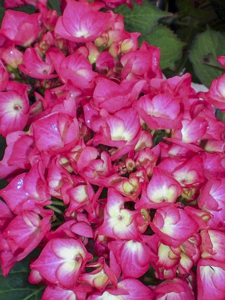 Compact. Inflorescences, rose fuchsia, évoluant au rouge profond. Jeune feuillage pourpre. Obtenu par croisement avec Hydrangea serrata 'Kyosumi'.
