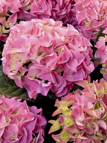 Compact. Inflorescences de type 'hortensia', de 15 cm de diamètre, rose vif à macules vertes s'estompant, en sol acide. Précoce. Moins exigeant en eau.