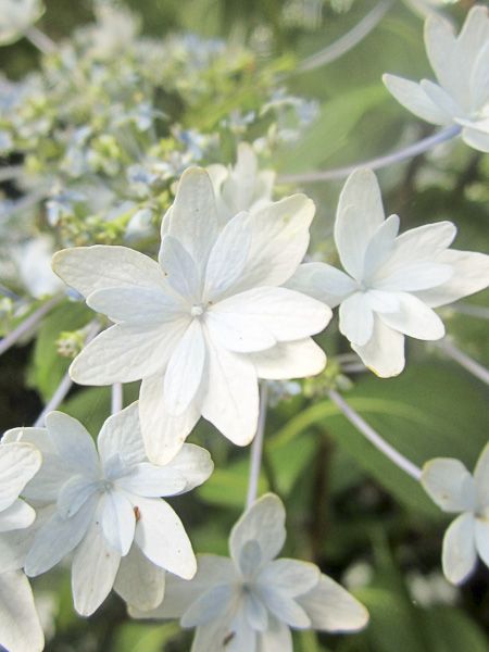 Inflorescences de type 'lacecap' aux fleurons stériles en étoile double, blanc. Les fertiles prennent une teinte bleutée en sol acide.