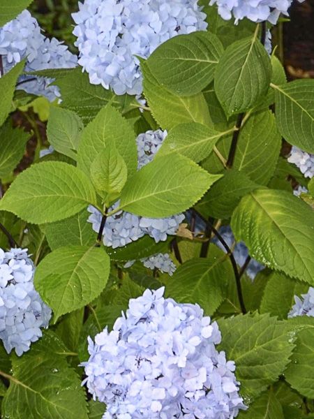 Tiges presque noires. Longue floraison en inflorescences hémisphériques de fleurs stériles bleu pâle en sol acide, rose-violacé en sol neutre.