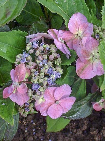 Forme basse. Inflorescences à tête plate. Fleurs fertiles et stériles roses à bleues selon l'acidité du sol.
