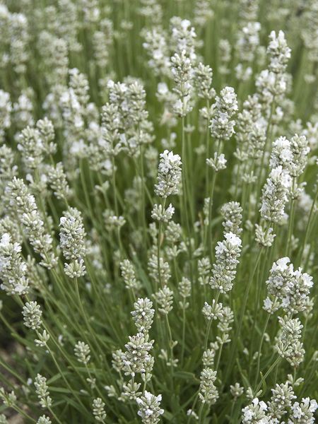 Lavande naine et compacte à feuilles gris argenté, étroites et aromatiques se caractérise par de courts épis de fleurs parfumées, blanc pur.