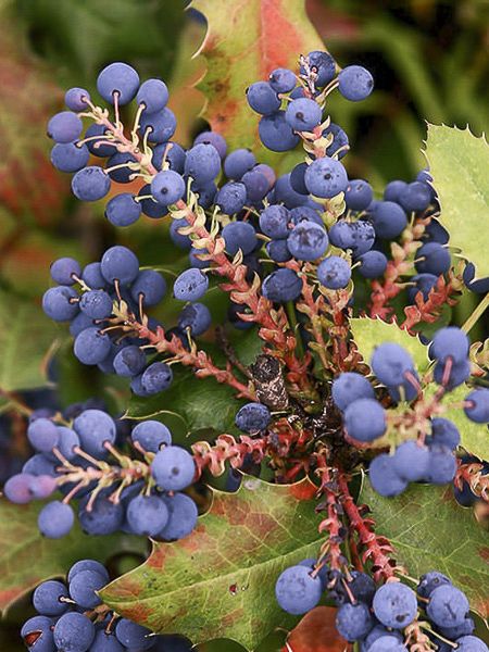 Arbuste ouvert, drageonnant à feuilles pennées, vert brillant, de 30 cm de long. Jusqu'à 9 folioles ovales, épineuses, se teintant de pourpre en hiver. Fleurs jaunes en bouquets de 8 cm, suivies de baie noir-bleuâtre.